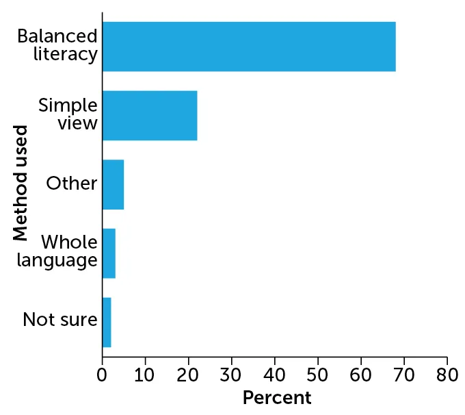在對近 700 名美國早期小學和特殊教育教師的隨機抽樣調查中,大多數人報告使用一種稱為平衡讀寫能力的方法來教授閱讀。專注於語音的簡單閱讀觀遠遠落後於第二位。