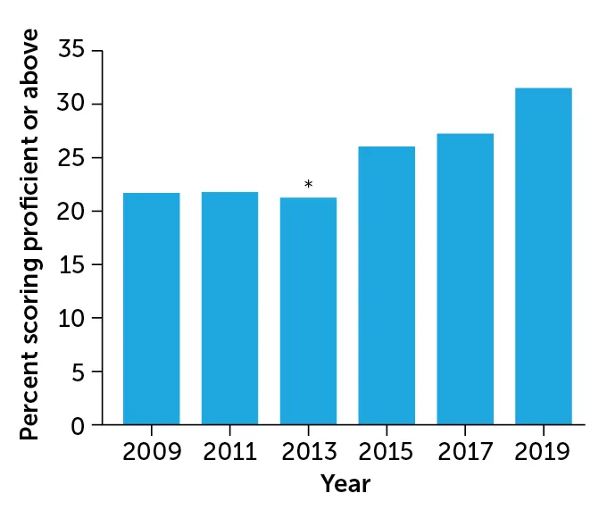 這些波動今天仍在繼續。 2019年,密西西比州的閱讀成績進步幅度全國最大;六年前,國家就開始對教師進行自然拼讀法教學培訓。密西西比州的閱讀成績首次達到全國平均水平,32% 的學生表現出熟練程度,高於 2009 年的 22%,使其成為 2019 年閱讀成績顯著提高的唯一州。