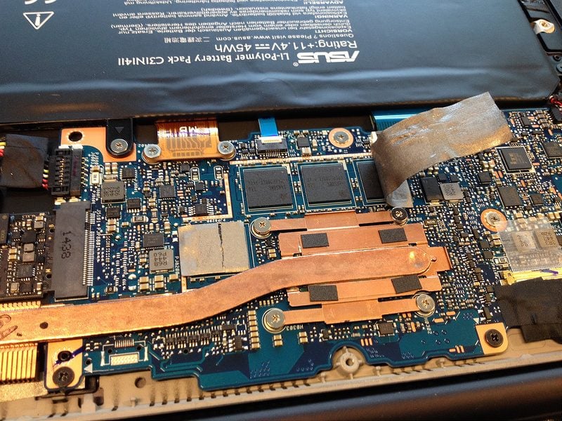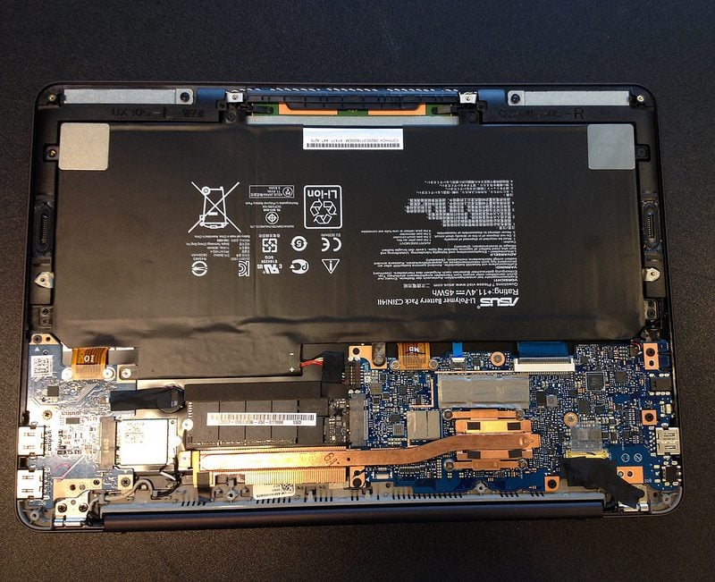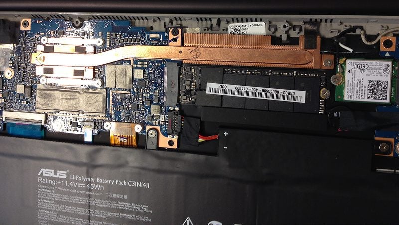 儘管我們仔細聆聽,但這台UX305FA卻以其沉默而閃耀。帶著懷疑,但又感到驚訝,我們用螺絲刀武裝自己,拆下了下部。在那裡,我們遇到了……沒有粉絲的情況。