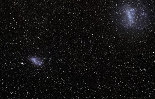 这些卫星星系距离我们分别约 160,000 光年和 200,000 光年,富含气体和年轻恒星。