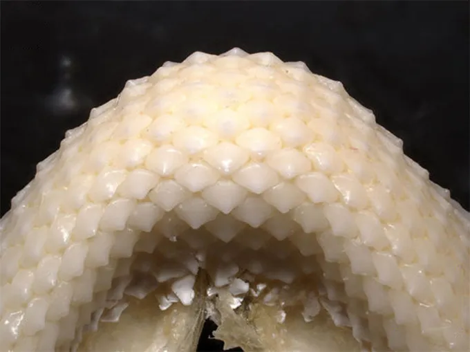 她与 10 条鲨鱼一起工作,记录了多次点击次数,在 20 秒的抓握过程中平均点击次数约为 9 次。这些声音可能来自于扁平牙齿与尖牙的碰撞声,这非常适合敲碎甲壳类动物的壳。一排排牙齿从牙龈组织中伸出,让她想起镶嵌在马赛克中的石头。