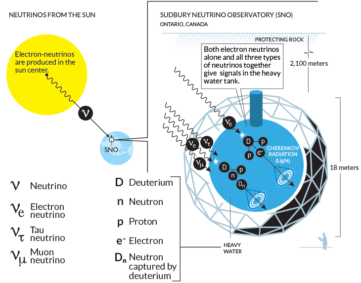 虽然超级神冈探测器为中微子振荡提供了令人信服的证据,但该实验无法证明中微子总数(无论味道如何)是一致的。几年之内,加拿大萨德伯里中微子观测站通过重新审视失踪的太阳中微子问题解决了这个问题。较小但仍然相当大的水箱充满了重水,它由氢原子和一个额外的中子组成。有时,电子中微子会撞击原子并产生可检测到的电子。其他时候,任何味道的中微子都会撞击原子并触发可检测中子的释放。通过研究这些相互作用,研究人员对总中微子和电子中微子进行了独立普查。