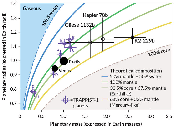 测量行星的质量和半径可以让天文学家了解行星的构成。该图将 TRAPPIST-1 行星(紫色)与地球、金星、一颗名为 K2-229b 的系外行星和其他几个世界进行了比较。